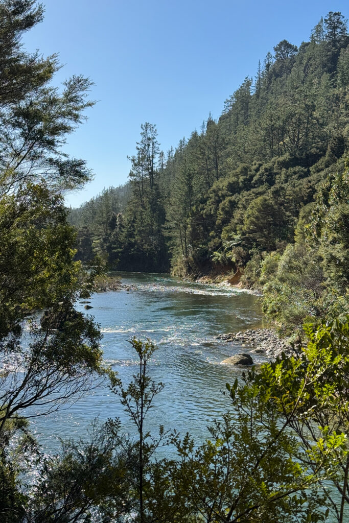 At the very start of the walk, you need to cross a small river that flows into the Tairua River. It was very cold and slippery, but with the water level below our knees we decided to go for it. Carrying our child as well as a Unirider across made it a bit of a mission. In the event of heavy rain or where the river is flooded, we strongly recommend instead doing this walk the regular way from the Broken Hills Campground. Do not underestimate the danger of a river crossing.